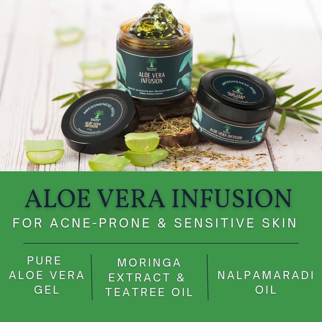 Nourish your skin with Infusion Aloe Vera Gel, enriched with Moringa, Nalpamaradi Oil, Tea Tree Oil, and Vitamin E. Hydrate, heal, and rejuvenate for a radiant glow.